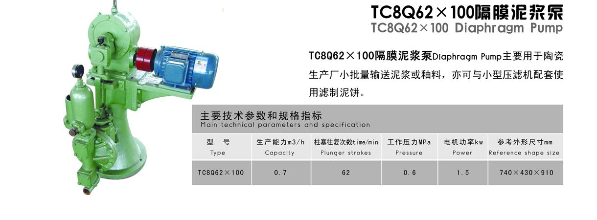TC8Q62×100隔膜泥漿泵主要用于陶瓷生產廠小批量輸送泥漿或釉料,亦可與小型壓濾機配套使用濾制泥餅。