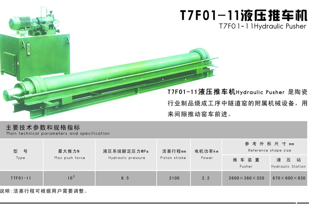 T7F01-11液壓推車機是陶瓷行業(yè)制品燒成工序中隧道窯的附屬機械設備,用來間隙推動窯車前進。