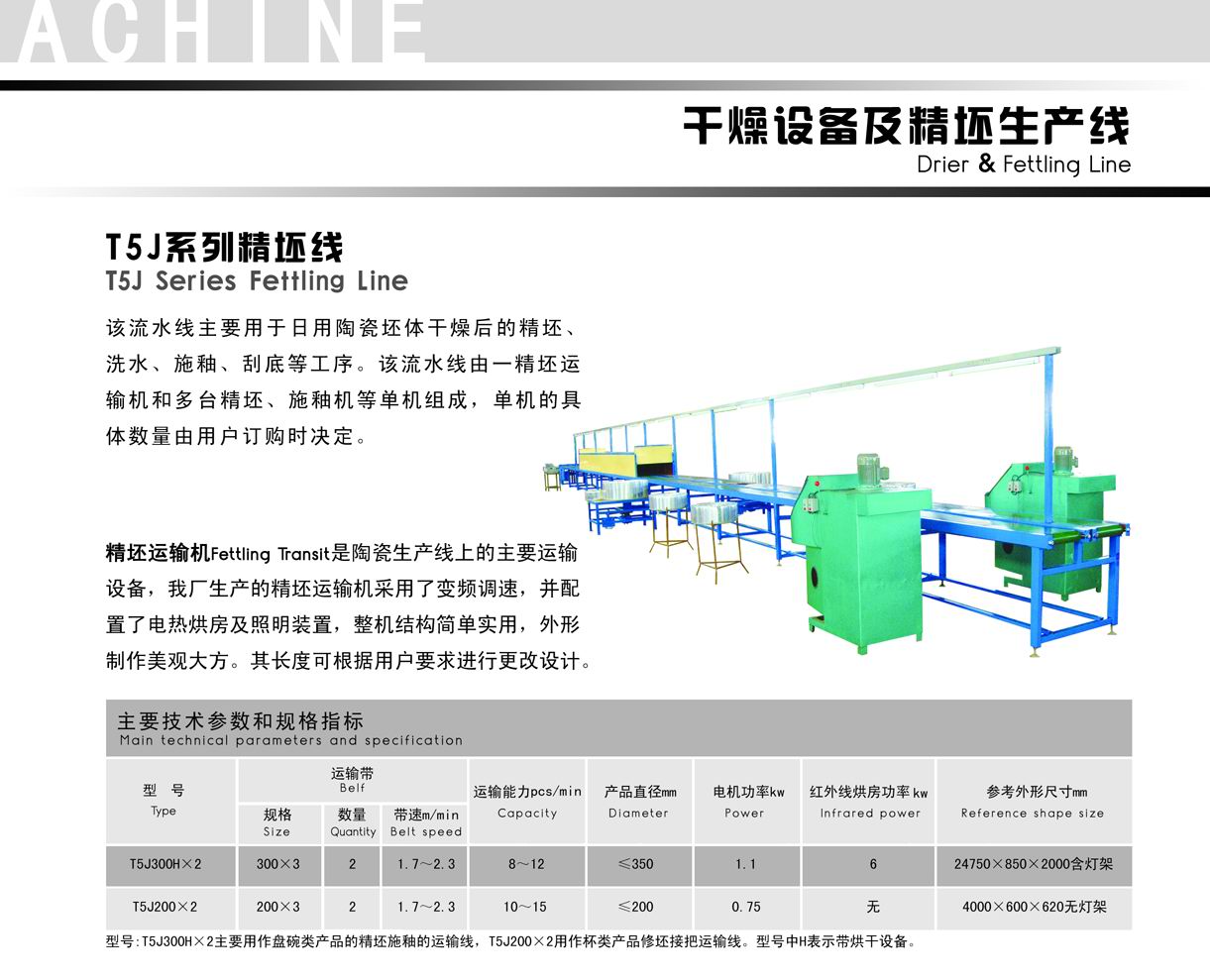 型號(hào):T5J300H×2主要用作盤碗類產(chǎn)品的精坯施釉的運(yùn)輸線,T5J200×2用作杯類產(chǎn)品修坯接把運(yùn)輸線。型號(hào)中H表示帶烘干設(shè)備。