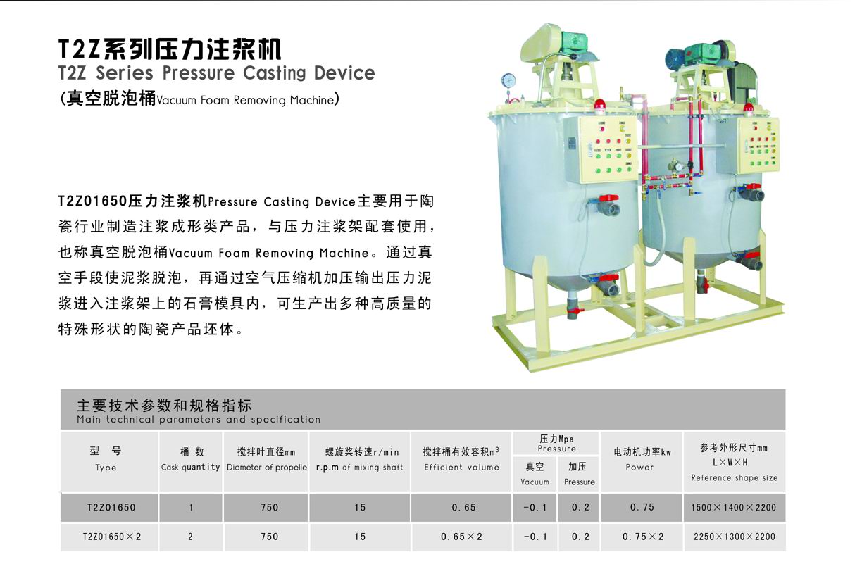 T2Z系列壓力注漿機(jī)主要用于陶瓷行業(yè)制造注漿成形類產(chǎn)品,與壓力注漿架配套使用,也稱真空脫泡桶。通過真空手段是泥漿脫泡,再通過空氣壓縮機(jī)加壓輸出壓力泥漿進(jìn)入注漿架上的石膏模具內(nèi),可生產(chǎn)出多種高質(zhì)量的特殊形狀的陶瓷產(chǎn)品坯體。